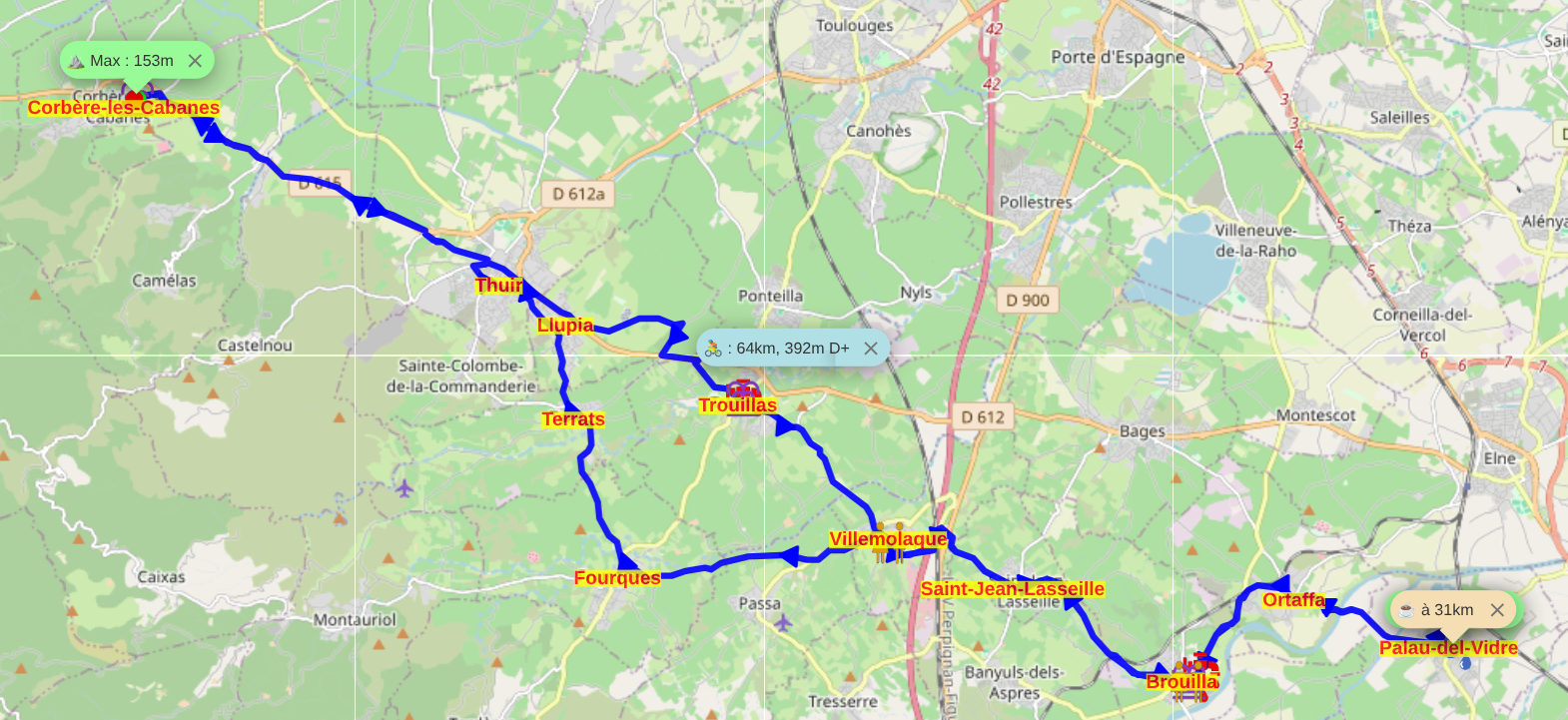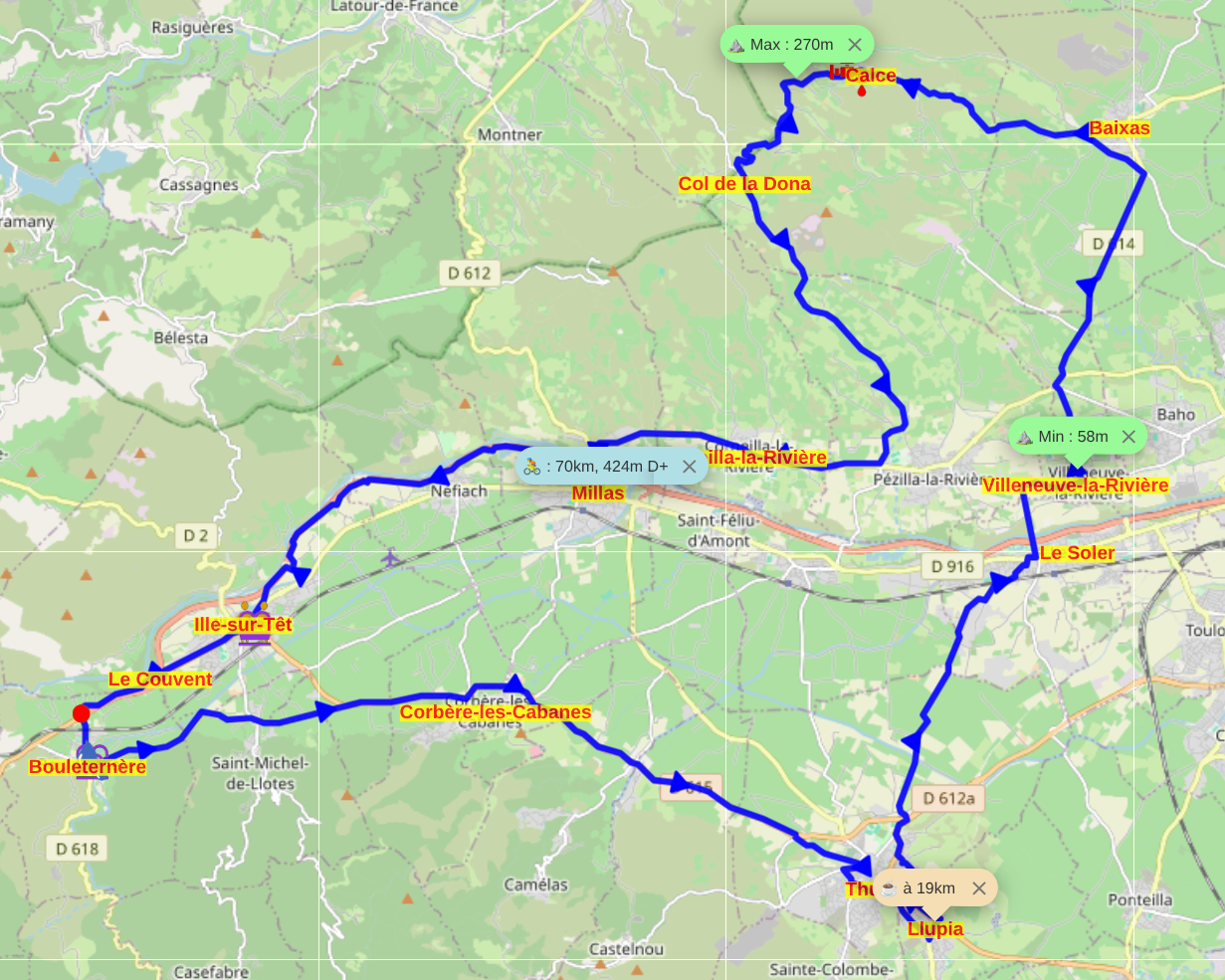 | Parcours Détaillé | Bouleternère - Corbère-les-Cabanes - Thuir - Llupia - Le Soler - Villeneuve-la-Rivière - Baixas - Calce - Col de la Dona - Corneilla-la-Rivière - Millas - Ille-sur-Têt - Le Couvent |