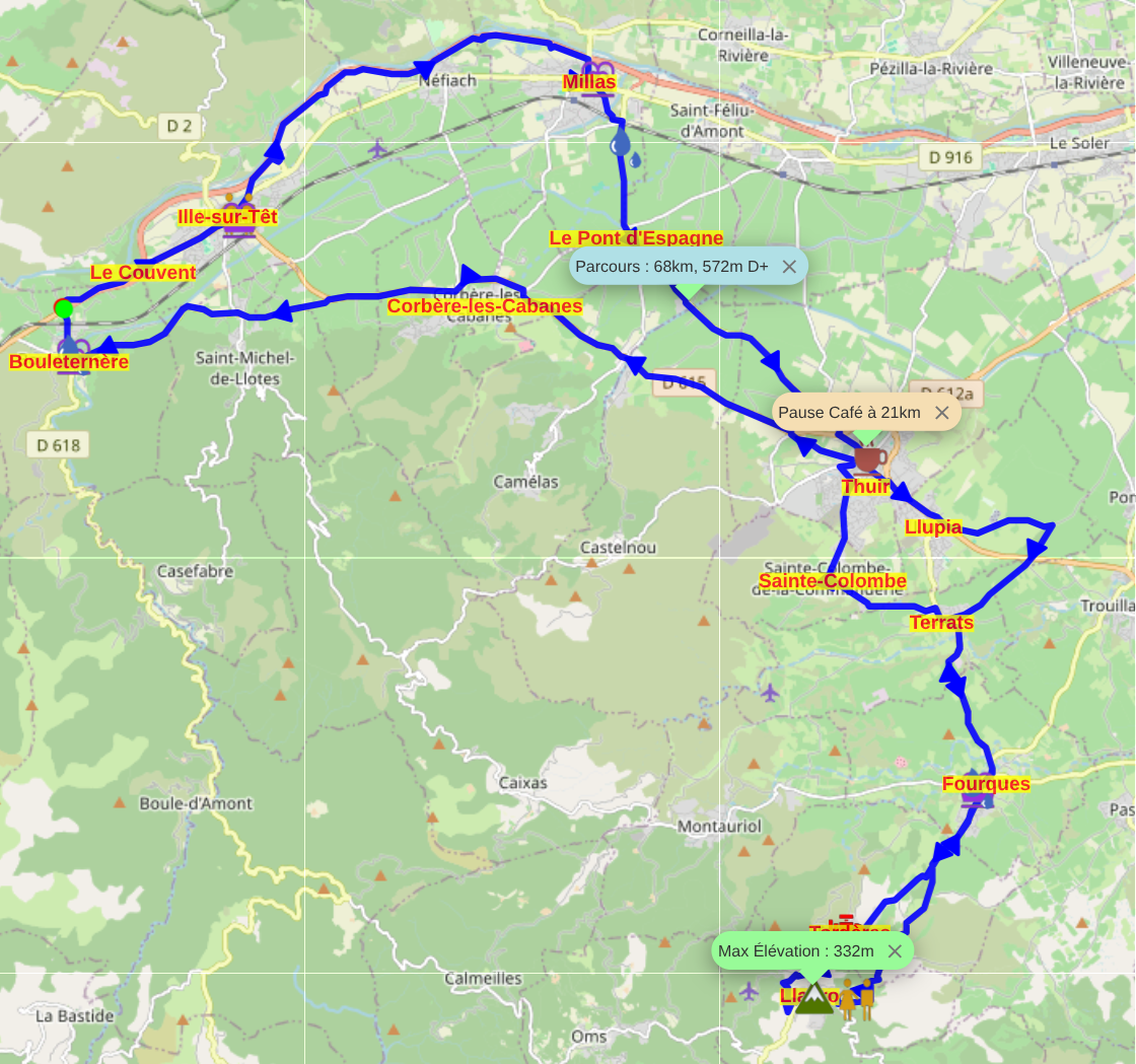 | Parcours Détaillé | Le Couvent - Ille-sur-Têt - Millas - Camping Le Pont d'Espagne - Thuir - Terrats - Fourques - Tordères - Llauro - Fourques - Terrats - Sainte-Colombe - Thuir - Corbère-les-Cabanes - Bouleternère |