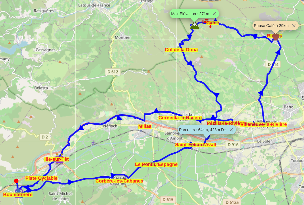 | Parcours Détaillé | Bouleternère - Corbère-les-Cabanes - Le Pont d'Espagne - Saint-Féliu-d'Avall - Pézilla-la-Rivière - Villeneuve-la-Rivière - Baixas - Calce - Col de la Dona - Corneilla-la-Rivière - Millas - Ille-sur-Têt - Piste Cyclable |