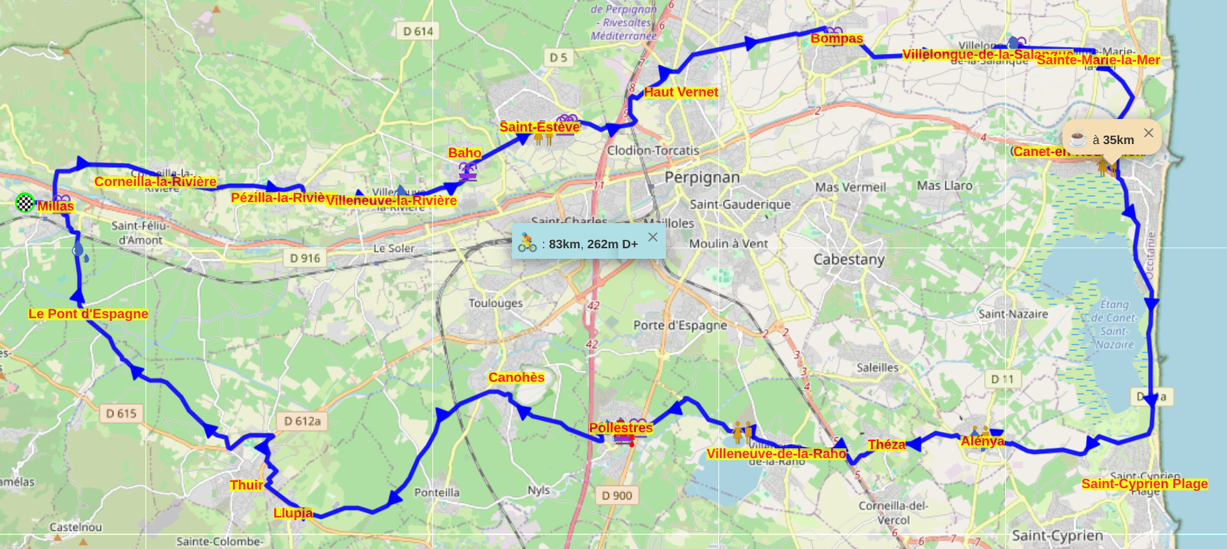 | Parcours Détaillé | Millas - Corneilla-la-Rivière - Pézilla-la-Rivière - Villeneuve-la-Rivière - Baho - Saint-Estève - Haut Vernet - Bompas - Villelongue-de-la-Salanque - Sainte-Marie-la-Mer - Canet-en-Roussillon - Saint-Cyprien Plage - Alénya - Théza - Villeneuve-de-la-Raho - Pollestres - Canohès - Thuir - Le Pont d'Espagne - Millas |